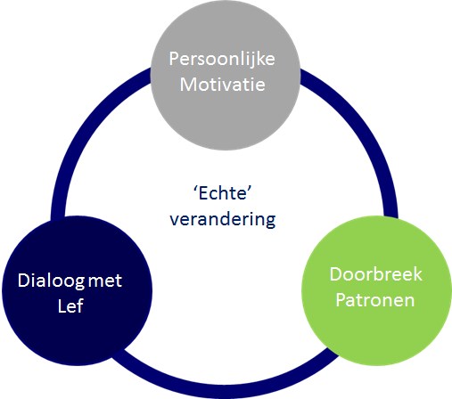 Elk verandertraject is uniek en op maat voor de klant. Flexibel, met focus op resultaat en een duurzame gedragsverandering. In mijn werkwijze maak ik gebruik van de 3 bouwstenen voor een ‘echte’ verandering. Dialoog met lef, Persoonlijke Motivatie en het Doorbreken van Patronen.